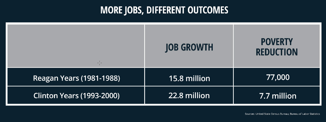 Of specific importance was a fundamental effort towards poverty reduction aiming to create an inclusive policy with the aim of augmenting the real incomes of the bottom 15% of wage earners; clearly growth would also involve the creation of employment. The outcomes for Reagan and Clinton administrations are shown on the right.