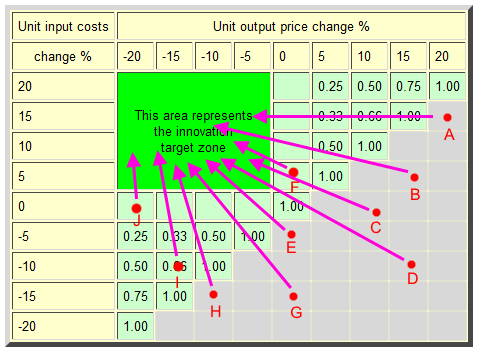 Corporate decision analysis and strategiesIt is often stated that policy needs to establish a level playing field. Current policies definitely do not provide this so each economic unit has to dance to the policy tune moulded by a range of centrall imposed disincentives. All economic units, at any point in time, face very different unit costs and feasible unit price circustances according to their sector, size of firm, location and many other factors. A level policy playing field must acknowledge this simple fact and thereby provide a clear pathway for each economic unit to improve performance. Therefore a supply side or real incomes policy needs to accommodate all possible circustances of the economic units. Below is a diagram showing possible locations of different cross-sector economic units within the PPR map. These are tagged as A through J.